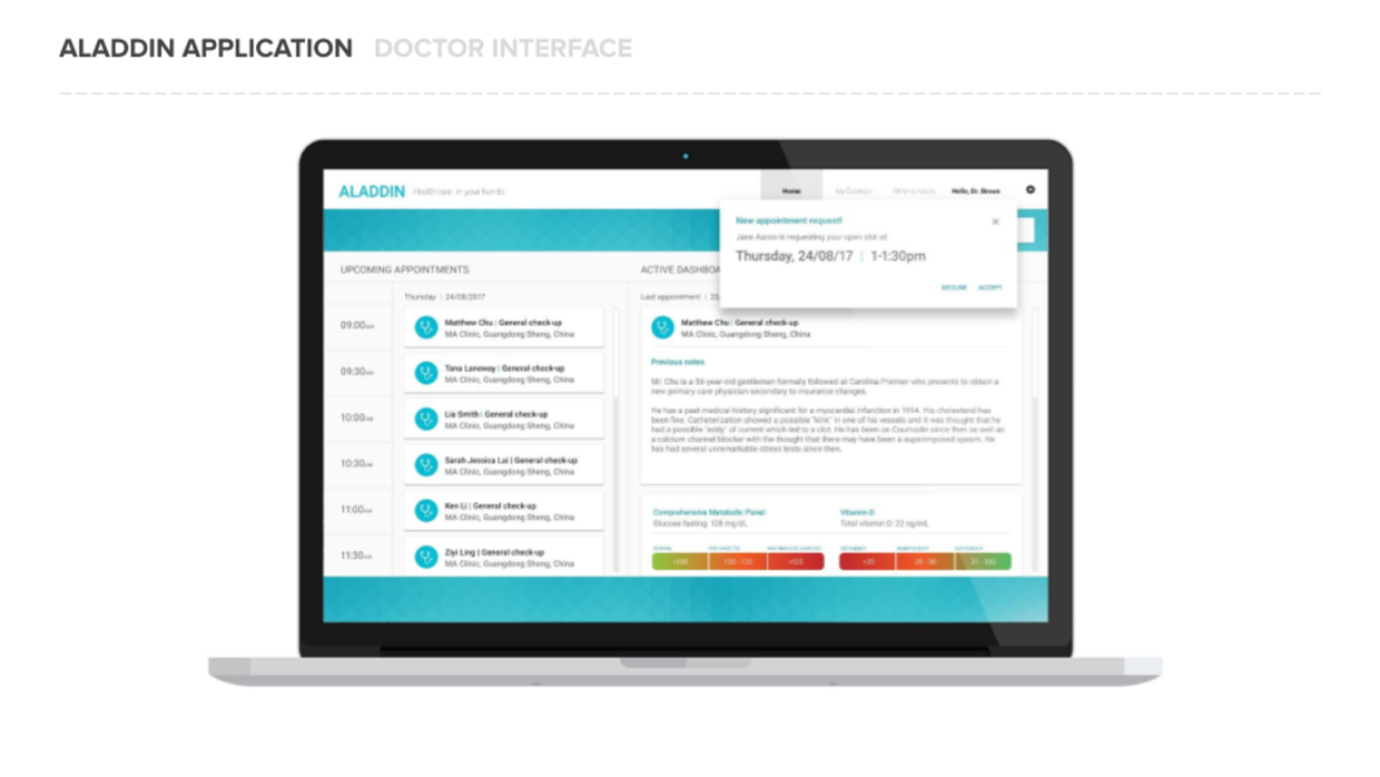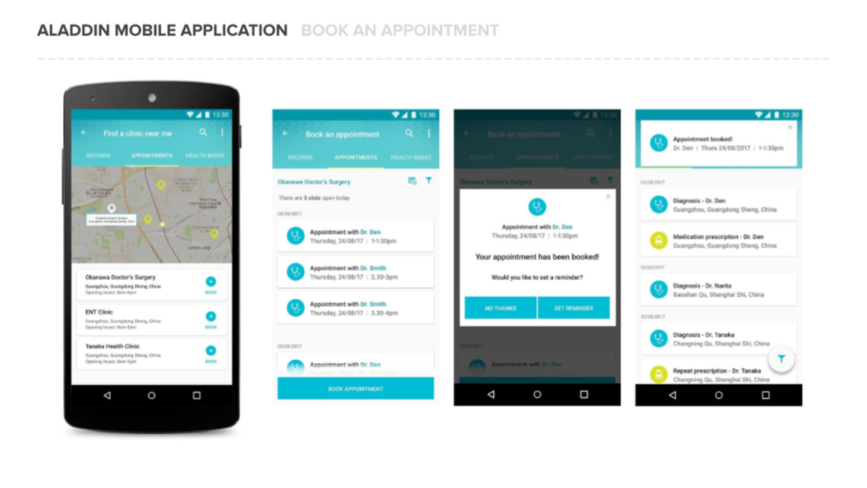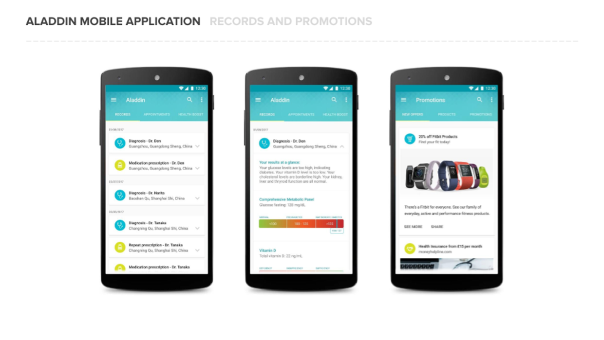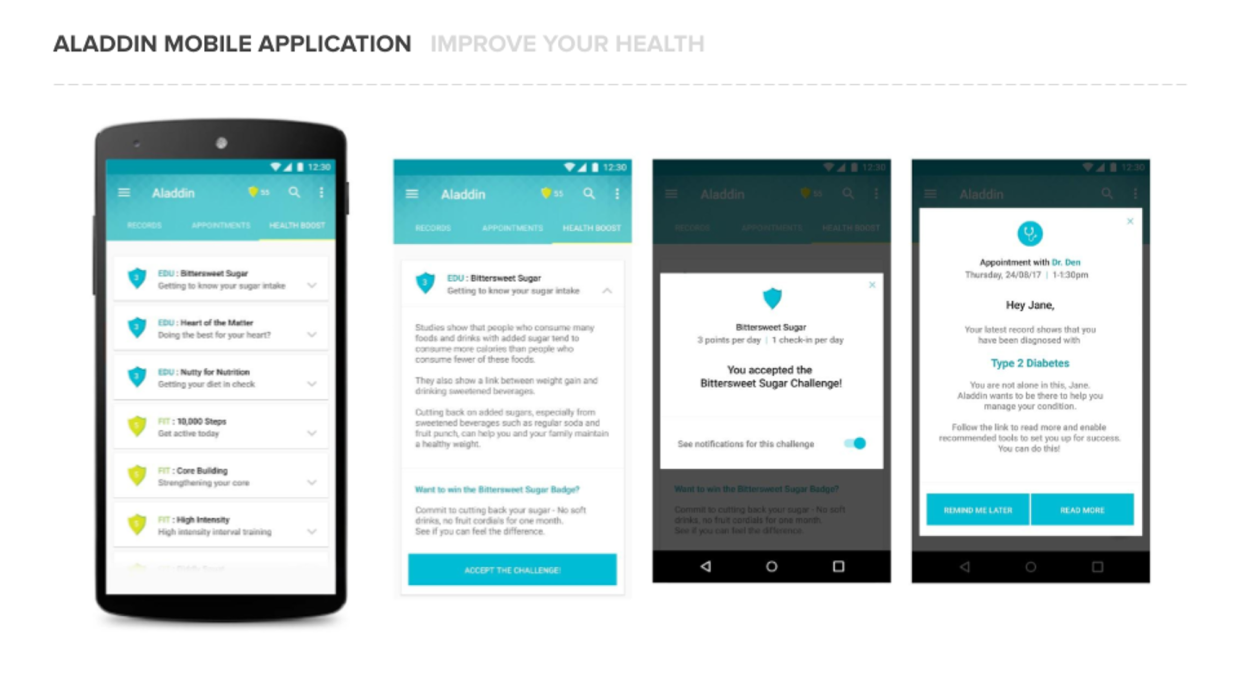 With the Aladdin application the users can access their full health records, organise medical appointments and medication. They can also track and engage with their health and acquire health and lifestyle products.