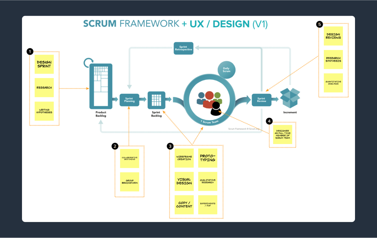 After the discovery workshop, the design, product, and engineering teams form a squad that operates within the Scrum framework, combined with a UX design process.