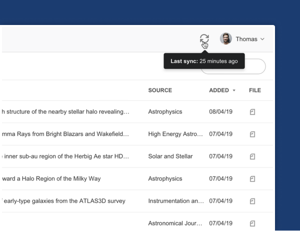 Mendeley Reference Manager is automatically synced whenever the user is online so they can access it on any device. Hovering over the sync icon will show when the last sync occurred. Clicking on the CTA will perform a manual sync.