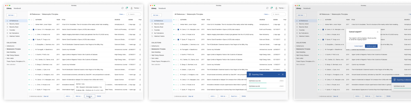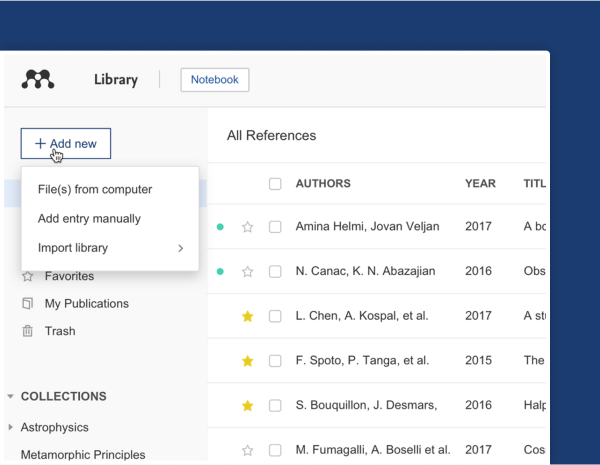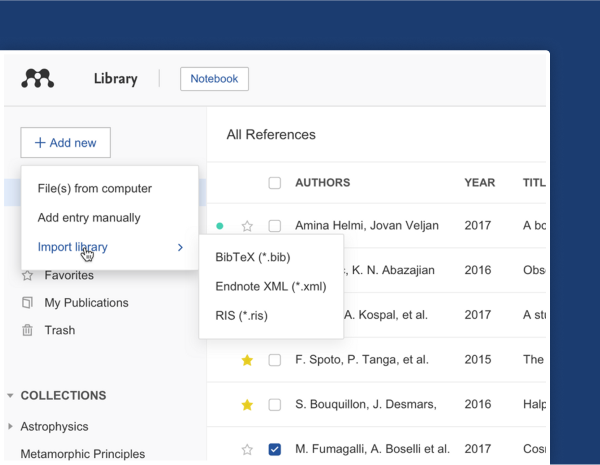 Lastly, The users can transfer their library from other reference managers by exporting it in BibTeX, EndNote XML or RIS file format and from the '+ Add new' menu select 'Import library >' to add it to MRM.