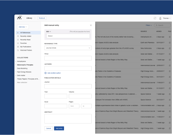The users can also manually input the details of a reference to create library entries when they don't have the PDF by selecting the 'Add entry manually' option in the '+ Add new' menu.